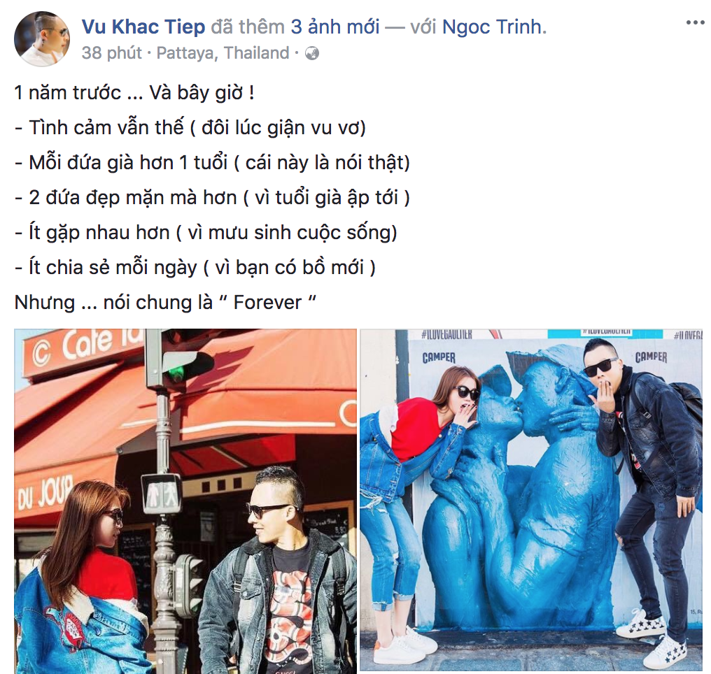 Kỷ niệm tình bạn của cả hai, Vũ Khắc Tiệp vừa hào hứng khoe loạt ảnh thân thiết 1 năm trước anh cùng Ngọc Trinh đi du lịch Thái Lan. Kèm theo tấm hình là những dòng tâm sự khá mùi mẫn. Theo anh, do bận rộn công việc, cả hai không gặp nhau nhiều, nhưng họ vẫn gắn bó keo sơn như thuở nào. Anh đặc biệt nhấn mạnh mối quan hệ gắn kết “Forever” (mãi mãi) của cả hai.