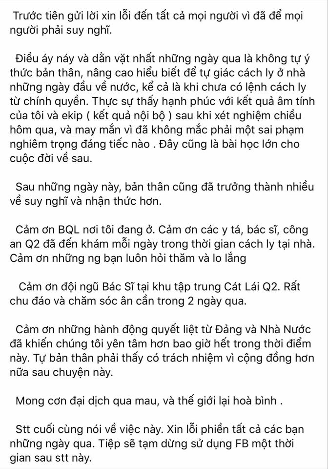 Anh chia sẻ: “Lời cảm ơn và xin lỗi. Trước tiên gửi lời xin lỗi đến tất cả mọi người vì đã để mọi người phải suy nghĩ. Điều áy náy và dằn vặt nhất những ngày qua là không tự ý thức bản thân, nâng cao hiểu biết để tự giác cách ly ở nhà những ngày đầu về nước, kể cả là khi chưa có lệnh cách ly từ chính quyền. Thực sự thấy hạnh phúc với kết quả âm tính của tôi và ekip ( kết quả nội bộ ) sau khi xét nghiệm chiều hôm qua, và may mắn vì đã không mắc phải một sai phạm nghiêm trọng đáng tiếc nào . Đây cũng là bài học lớn cho cuộc đời về sau.