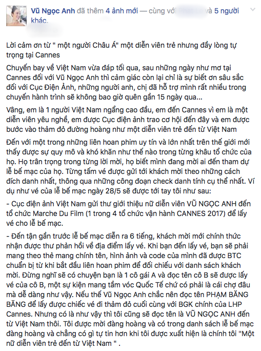 - Cục điện ảnh Việt Nam gửi thư giới thiệu nữ diễn viên VŨ NGỌC ANH đến tổ chức Marche Du Film (1 trong 4 tổ chức vận hành CANNES 2017) để lấy vé cho lễ bế mạc.