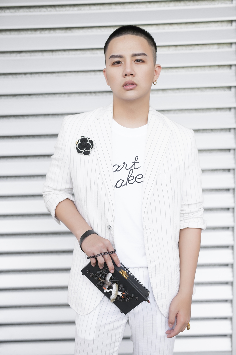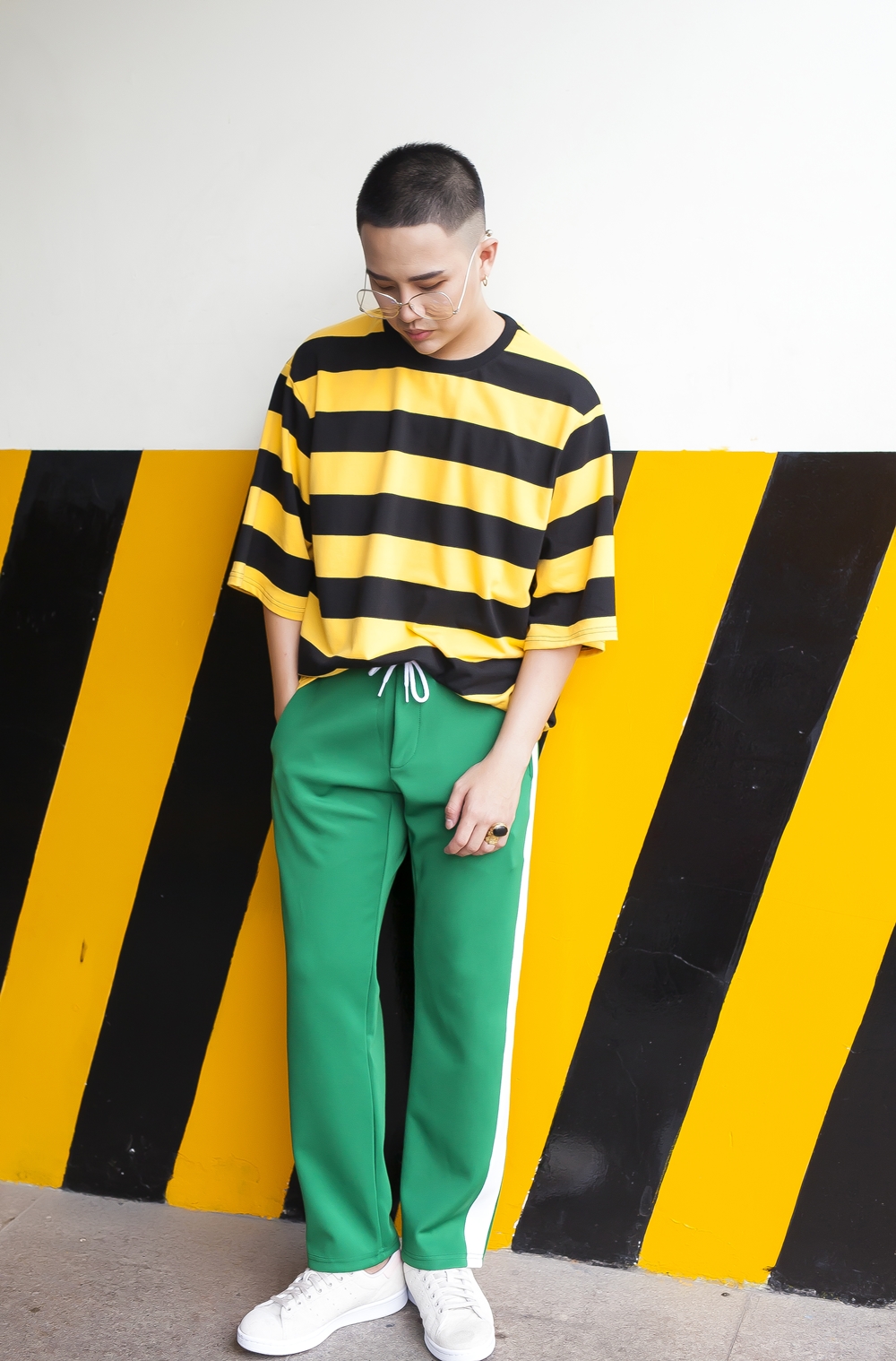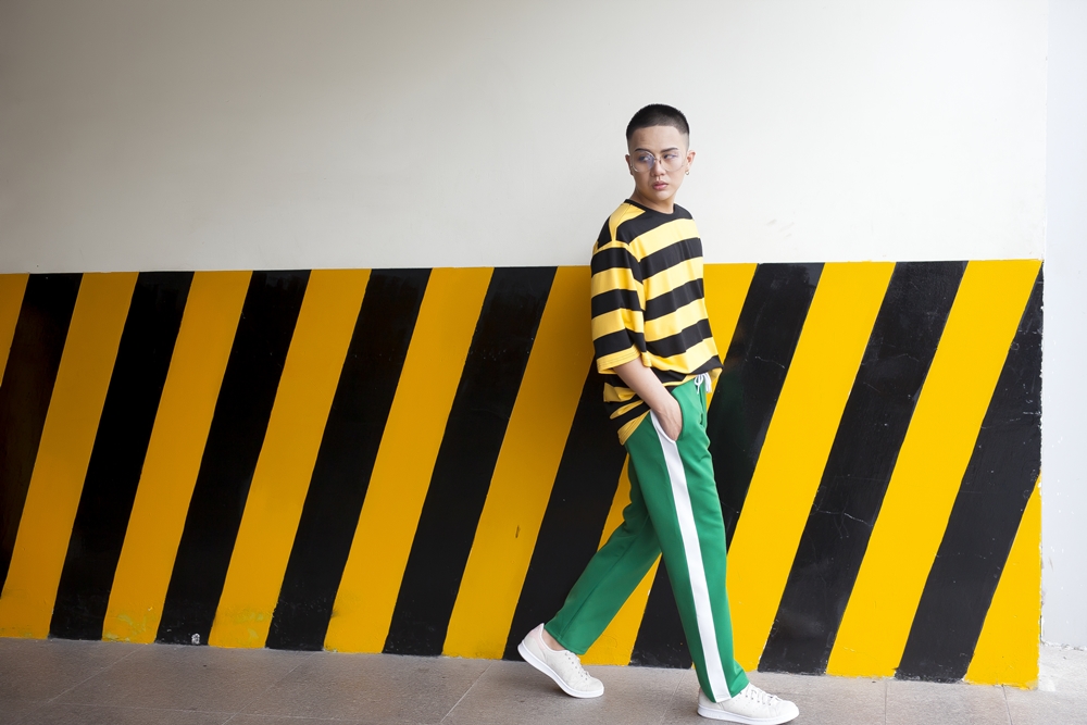 Trên nền xanh pastel ngọt ngào, họa tiết quả cam màu vàng rực rỡ giúp Duy Khánh trở nên nổi bật khi xuống phố.