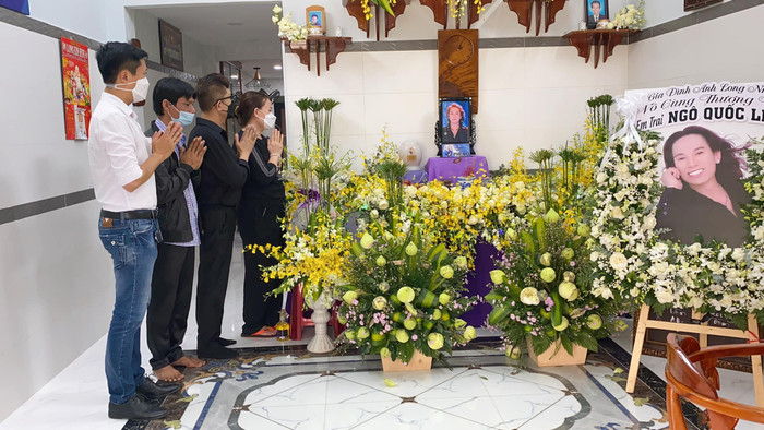 Long Nhật đặt vòng hoa màu trắng có chân dung của Ngô Quốc Linh kèm dòng chữ: "Gia đình anh Long Nhật, vô cùng thương tiếc em trai Ngô Quốc Linh".
