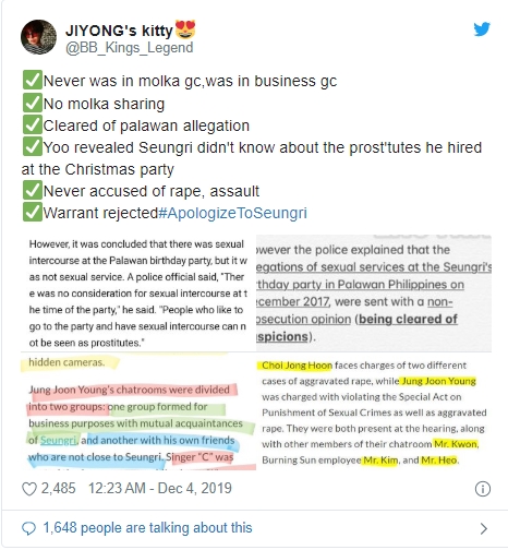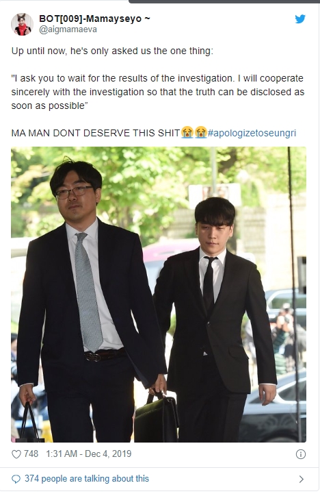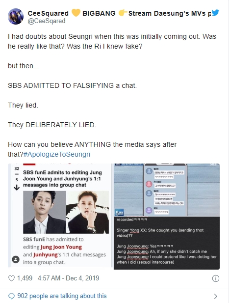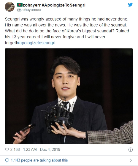 Ngay lập tức, người hâm mộ nổi cơn thịnh nộ và yêu cầu truyền thông cũng như những người từng tung tin đồn ác ý phải xin lỗi Seungri về vụ việc. Theo những tin nhắn kể trên, có thể thấy nam ca sĩ không hề đồng tình với việc quay clip lén hay tham gia vào vụ việc. Cụm từ #ApologizeToSeungri nhanh chóng leo lên top 1 trending thế giới.