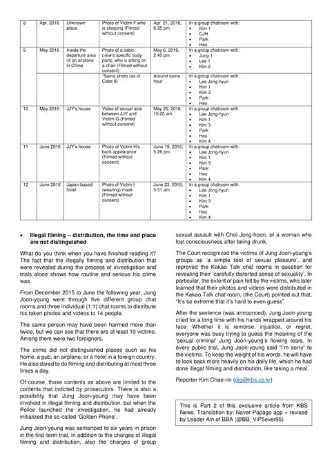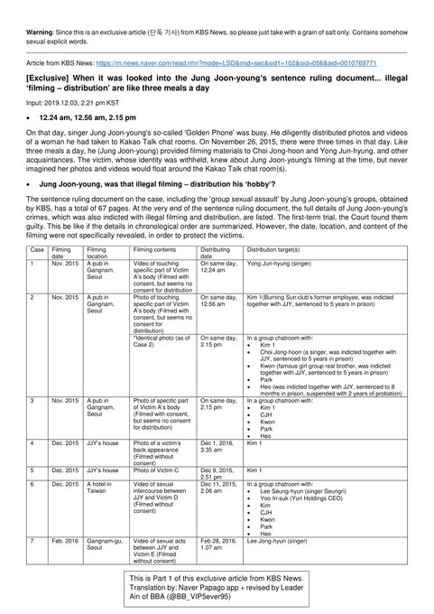 Mới đây, KBS đã đăng tải lên Twitter nội dung tất cả các tin nhắn trong nhóm chat bất hợp pháp của Jung Joon Young. Trong đó, Seungri xuất hiện một lần trong các cuộc trò chuyện, khi một thành viên chia sẻ đoạn clip quay lén phụ nữ cho các thành viên trong nhóm.