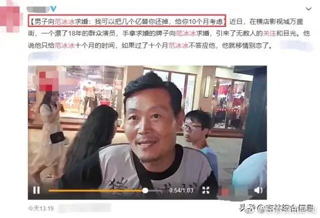Mới đây, một người đàn ông ở Hoành Điếm đã mang theo tấm bìa đặt ở trước ngực với nội dung muốn cầu hôn Phạm Băng Băng. Theo thông tin được biết, người này là vô gia cư, cũng là diễn viên quần chúng tuyến 18 trên những phim trường tại nơi đây. Với tấm bìa có câu từ gây sốc như thế khiến phóng viên tò mò, liền tìm đến và phỏng vấn ông ta.