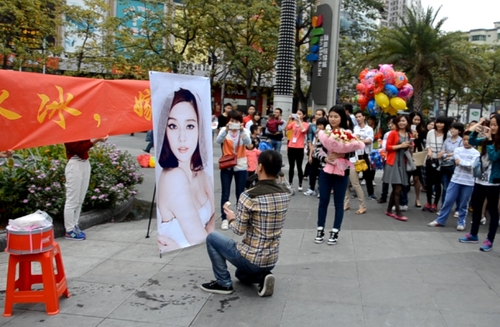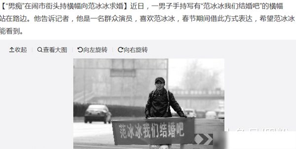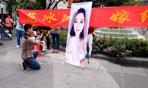 Cách đó 1 năm trước, cũng có một thanh niên trẻ ra giữa phố quỳ xuống cầu hôn …. ảnh của nàng hoa đán rồi hô lớn: “Phạm Băng Băng, hãy cưới anh đi em”. Thậm chí, người này còn mua nhẫn kim cương để làm công cụ hỗ trợ. Thanh niên này thổ lộ: “Dù có điên rồ nhưng đây là hành động thể hiện thanh xuân của tôi. Tôi không nghĩ bản thân sẽ cầu hôn cô ấy thành công, nhưng tôi mong Phạm Băng Băng biết về tình cảm của bản thân mình”.