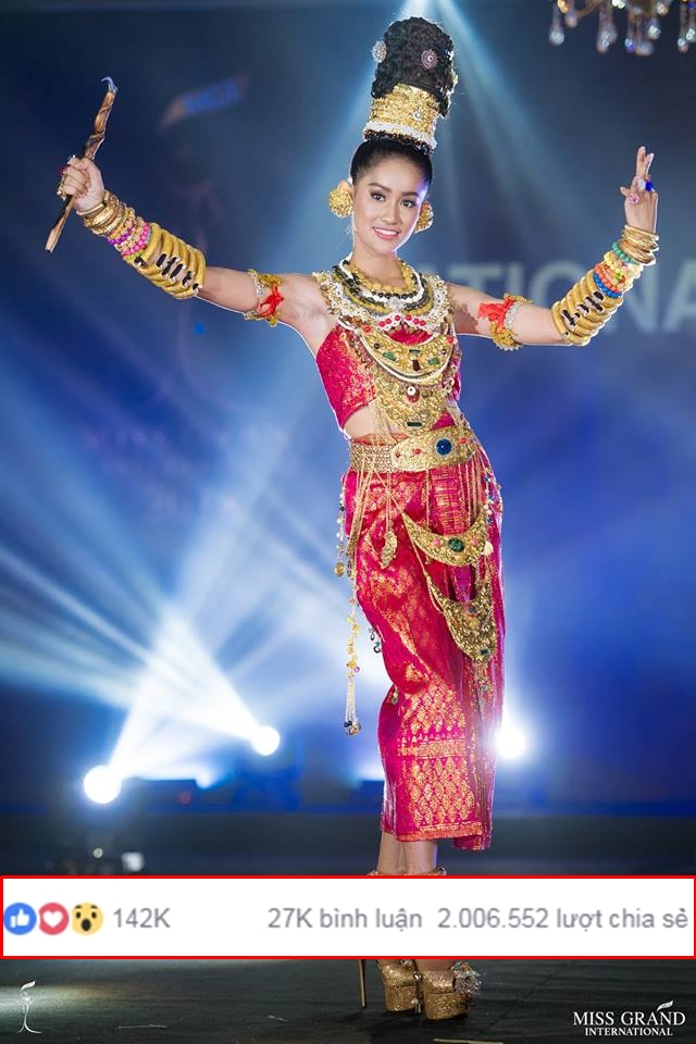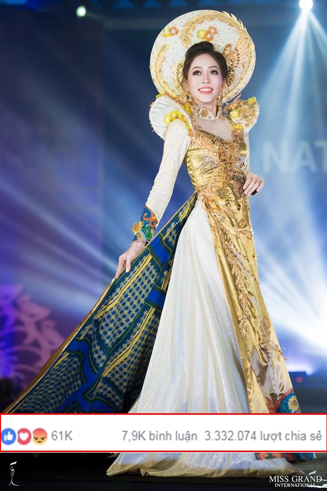 Tính đến 12h ngày 15/10, bức ảnh diện quốc phục của Phương Nga đang có hơn 3.332.000 lượt share và 61.000 like. Số điểm từ lượng tương tác này chắn chắn giúp Phương Nga lọt Top 20 sau khi Miss Grand International đóng cổng vote National Costume lần 1.