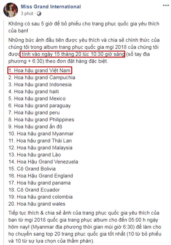 5 tiếng đồng hồ trước khi đóng cổng bình chọn lần 1 phần thi Best National Costume của Miss Grand International 2018, đại diện Việt Nam - Bùi Phương Nga vẫn vượt mặt người đẹp Campuchia, Indonesia giữ vững vị trí đầu tiên. Dù dẫn đầu bình chọn nhưng fan Việt đang lo lắng cho Phương Nga bởi cô nàng liên tục bị fan của các đối thủ tố gian lận bình chọn.