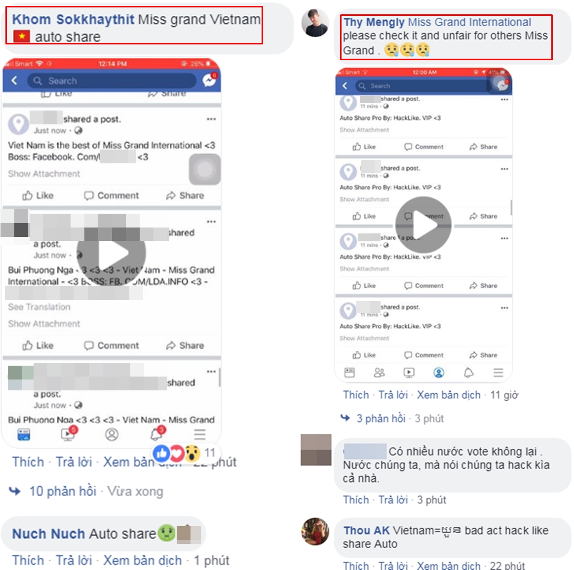 Tuy vậy, bên dưới bức ảnh của Phương Nga xuất hiện hàng loạt bình luận cho rằng fan Việt đang dùng chiêu hack share để đưa người đẹp gốc Hà Nội dẫn đầu bình chọn. Phần lớn bình luận có ý tố cáo gian lận thuộc về các fan Campuchia - những cư dân mạng cũng đang ra sức bình chọn cho đại diện nước nhà giành ưu thế với giải Trang phục dân tộc đẹp nhất.