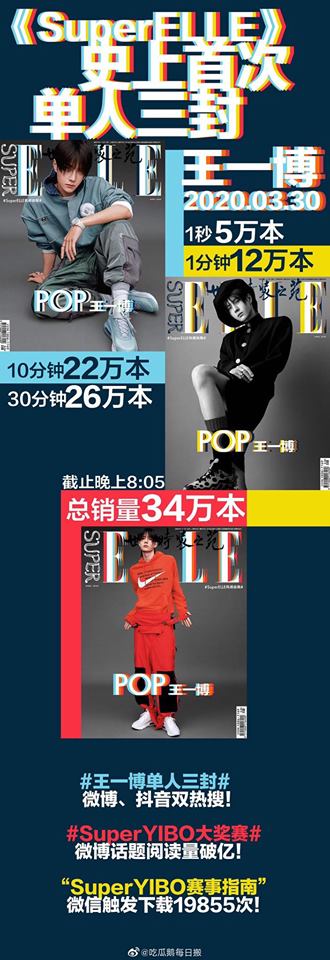 Vương Nhất Bác gây ấn tượng mạnh khi trở thành gương mặt trang bìa trên tạp chí của tạp chí Supper Elle. Đặc biệt mỗi tháng, tạp chí này sẽ phát hành ba phiên bản bìa khác nhau. Nhưng số tháng này, Vương Nhất Bác chiếm trọn tất cả, trở thành người đầu tiên tạo nên tiền lệ này. Để ủng hộ cho việc tạp chí đã ưu ái, tin tưởng Vương Nhất Bác, fan hâm mộ liền dốc túi tiền để tăng doanh thu, tạo số liệu đẹp cho thần tượng.