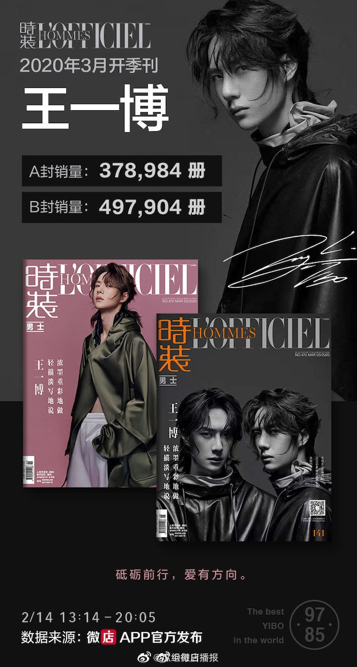 Vào tháng trước, tạp chí Ngũ đại nam L’Officiel Hommes công bố lượng tiêu thụ số tháng của Vương Nhất Bác đạt hơn 870 ngàn bản với doanh thu 25 triệu NDT (85 tỷ đồng) chưa đầy một ngày. Hiện tại, kỷ lục này của anh chàng vẫn chưa bị phá vỡ, thứ hạng 2-3 vẫn là của Vương Nhất Bác với những tạp chí khác nhau. Một con số khiến nhiều người phải choáng ngợp trước sức thu hút của một minh tinh lưu lượng.