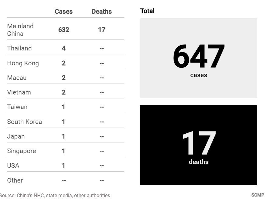 Tính đến tối thứ Năm ngày 23/01 vừa qua, các trường hợp mắc bệnh đã xuất hiện ở 23 tỉnh, bốn thành phố, khu vực hành chính đặc biệt của Hồng Kông và Ma Cao, và sáu quốc gia khác bao gồm 2 trường hợp ở Việt Nam. Theo đó, có 623 trường hợp bị virus tại Trung Quốc Đại Lục và ghi nhận 17 trường hợp tử vong. Được biết, tất cả những cái chết đều ở tỉnh Hồ Bắc.