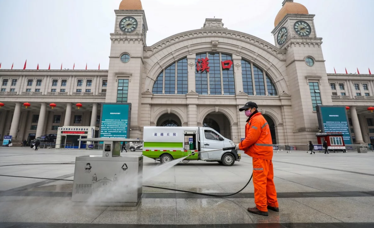 Nhân viên công cộng khử trùng trước nhà ga Vũ Hán.
