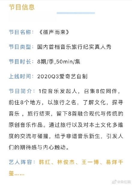 Weibo rộ lên tin đồn cho biết IQIYI sẽ cho ra đời chương trình thực tế mới kết hợp giữa âm nhạc và du lịch với sự tham gia của một số minh tinh như Hàn Hồng, Lâm Tuấn Kiệt,Vương Nhất Bác, Dịch Dương Thiên Tỉ... mang tên Đi theo âm nhạc.