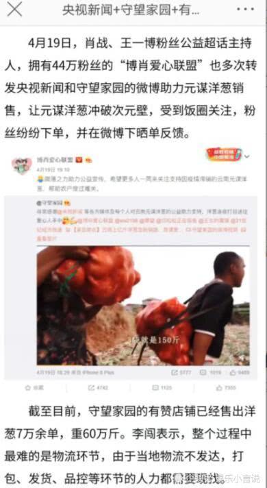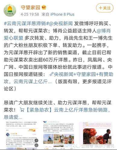 Gần đây, CCTV News và trang Canh gác gia viên đã đăng bài viết quảng bá trên Weibo để giúp người dân tại huyện Nguyên Mưu bán hành tây. Tại siêu chủ đề Bác Tiêu (fan couple Vương Nhất Bác - Tiêu Chiến) đã nhiều lần quảng bá, tích cực mua hàng để giúp đỡ người dân. Thậm chí người hâm mộ của Vương Nhất Bác và Tiêu Chiến còn mở kênh bán hàng mới để giúp hành tây của huyện Nguyên Mưu được dễ dàng tiếp cận với mọi người và tiêu thụ nhanh chóng hơn. Cho đến nay, huyện Nguyên Mưu đã bán được hơn 70 ngàn đơn hành tây, tiêu thụ được 300 tấn.
