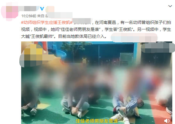 Tại một trường mẫu giáo ở Hà Nam (Trung Quốc), một cô giáo cầm điện thoại ghi lại khoảnh khắc với các em nhỏ. Trong video, cô giáo hỏi: “Bạn trai của cô Gia Gia là ai?” Học sinh liền trả lời: “Vương Tuấn Khải”. Trong một video khác, các em học sinh hô to: “Vương Tuấn Khải là người đẹp trai nhất”.