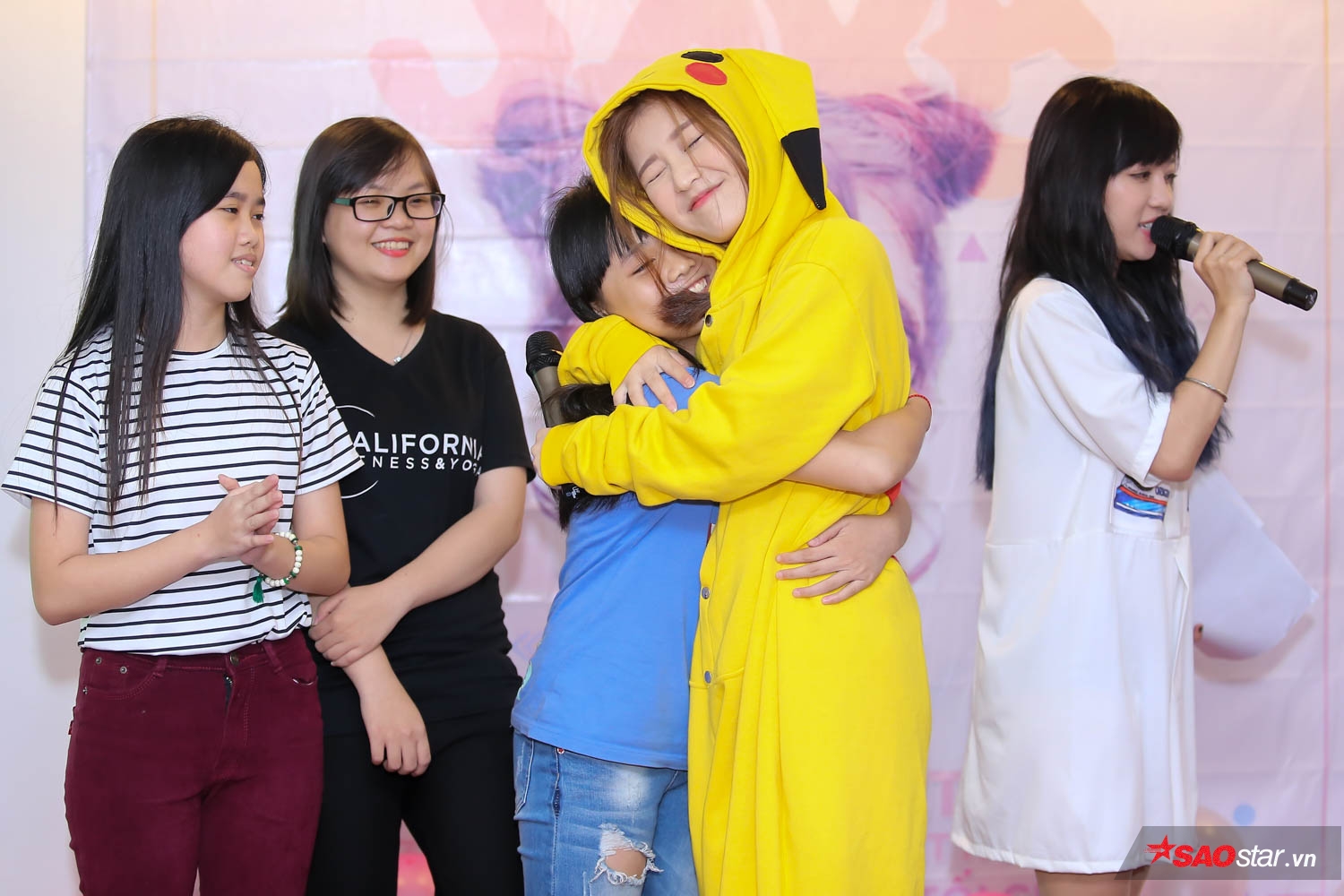 Chi tiết khiến cả khán phòng có phần xúc động là khi xuất hiện một fan nam đến từ thủ đô Hà Nội. Được biết, vì muốn gặp thần tượng ngoài đời thực, cậu bạn đã đi xe máy hàng ngàn cây số để được tham gia fan meeting.