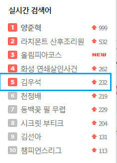 Trong lĩnh vực giải trí ở bảng xếp hạng này, theo sau từ khóa “Kim Woo Seok” là từ khóa về phim “Khi hoa trà nở” ở hạng 7. Cuối cùng, từ khóa về diễn viên “Kim Sun Ah” đứng hạng 9. Những từ khóa còn lại thuộc lĩnh vực chính trị, đời sống, xã hội…