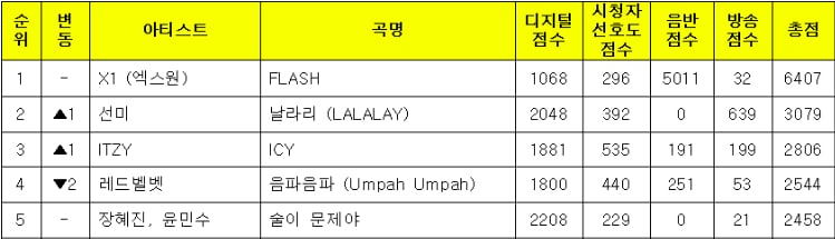 Ca khúc FLASH của X1 giành chiến thắng với 6407 điểm, vượt qua ca khúc LALALAY của Sunmi với 3079 điểm. Vị trí thứ ba thuộc về ICY của nhóm ITZY. Trong khi, Umpah Umpah của Red Velvet và Drunk on Love do Jang Hye Jin - Yoon Min Soo thể hiện, lần lượt đứng ở vị trí thứ 4 -5.