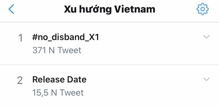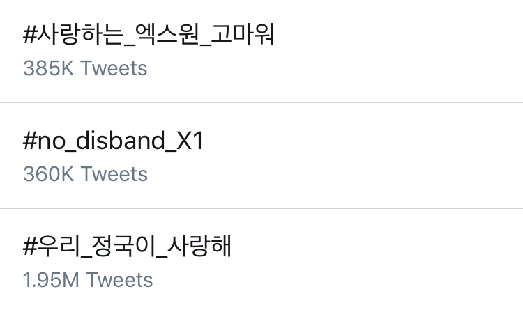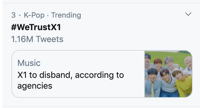 Vào sáng ngày 07/01, hashtag #No_disband_X1 (Không giải tán X1), #사랑하는_엑스원_고마워 (Cảm ơn X1 thân yêu) và #RebootX1 (Khởi động lại X1)đã đưa X1 trở lại và đứng đầu trending trên toàn thế giới. Nhóm chính thức tan rã sau khi không đạt được thỏa thuận cuối cùng với 11 công ty quản lý, người hâm mộ bày tỏ sự tức giận và buồn bã với những tin tức đau lòng này bằng những xu hướng hashtag trên mạng xã hội toàn cầu Twitter. Theo đó, các hashtag đang ngày càng tăng lên và có sức ảnh hưởng đáng kinh ngạc.