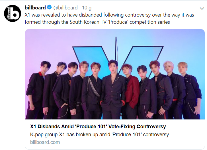 Nhóm nhạc nam X1 chính đã tan sau những tranh cãi về những cáo buộc liên quan tới vụ thao tung trong cuộc thi Produce X 101 trên đài truyền hình Hàn Quốc. Đại diện công ty chủ quản của 11 thành viên đã phát hành một thông cáo báo chí chung: “Các thành viên X1 và từng công ty đã đàm phán với điều kiện nhất trí, nhưng chúng tôi không thể đi đến thỏa thuận, vì vậy chúng tôi đã quyết định giải tán nhóm”.
