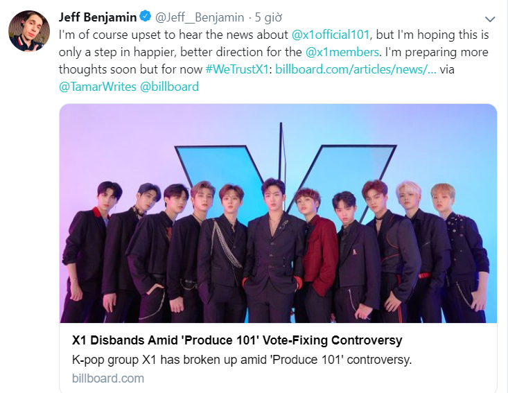 Phóng viên nổi tiếng Jeff Benjamin người Mỹ đã chia sẻ bài báo kèm theo chú thích: “Tất nhiên tôi rất buồn khi nghe tin tức về X1, nhưng tôi hy vọng đây chỉ là một bước chuyển mình hạnh phúc hơn, tốt hơn cho định hướng của các thành viên X. Tôi sớm chuẩn bị nhiều suy nghĩ hơn nhưng hiện tại #WeTrustX1 (Chúng tôi tin X1)”.