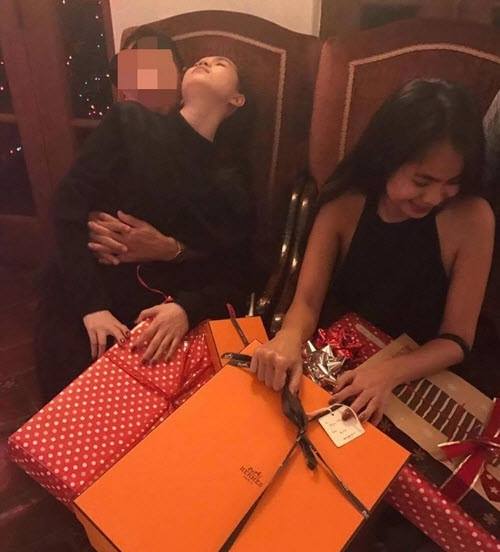 Dù bên cạnh là bạn bè của tỷ phú Hoàng Kiều nhưng người đẹp vẫn không ngần ngại ngồi trong lòng bạn trai hơn 45 tuổi.