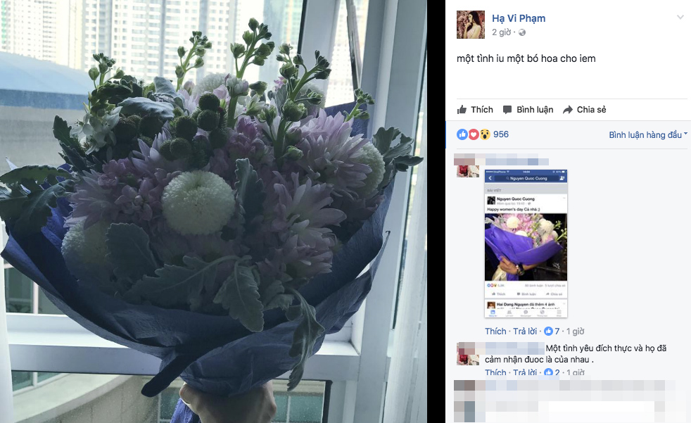 Tuy nhiên, mới đây, cả Cường Đô la lẫn Hạ Vi đều đăng tải trên Facebook cá nhân một bó hoa giống hệt nhau. Nếu doanh nhân trẻ tay ôm bó hoa to và ghi chú thích “Happy women's day cả nhà“, thì nữ diễn viên 9X lại hạnh phúc hoa được tặng dùng dòng cảm xúc: “Một tình yêu, một bó hoa cho em“.