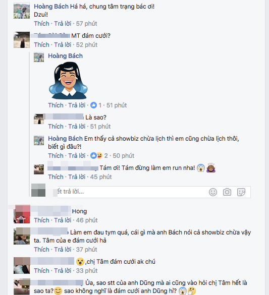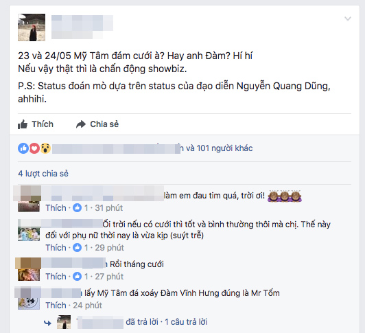 Ca sĩ Hoàng Bách bày tỏ sự bất ngờ. Trong khi, nhiều fan cho rằng Mỹ Tâm sẽ kết hôn.