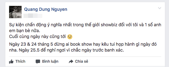 Cuối cùng ngày này cũng tới. Ngày 23-24 tháng 5 đừng ai book show hay kêu tui họp hành gì ngày đó nha. Ngày 25/5 để nghỉ ngơi vì chắc ngày trước banh xác” - Nguyễn Quang Dũng viết.