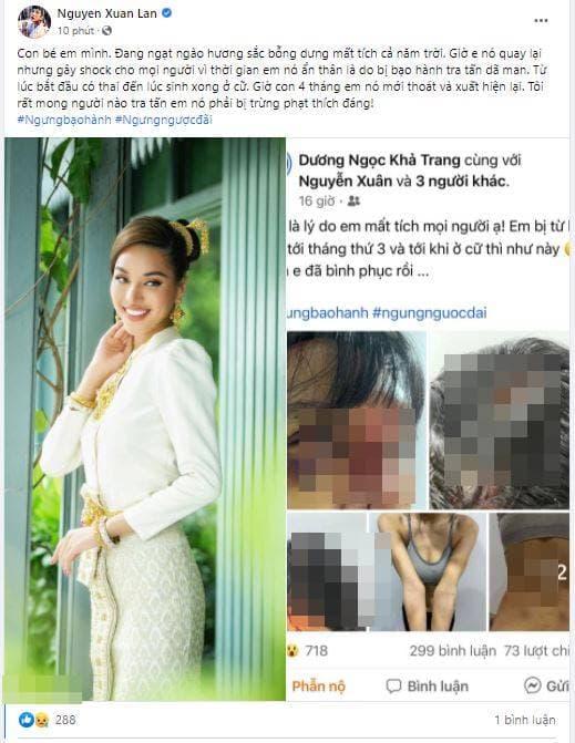 Siêu mẫu tỏ vẻ bức xúc: "Con bé em mình. Đang ngạt ngào hương sắc bỗng dưng mất tích cả năm trời. Giờ em nó quay lại nhưng gây sốc cho mọi người vì thời gian em nó ẩn thân là do bị bạo hành, tra tấn dã man. Từ lúc bắt đầu có thai đến lúc sinh xong ở cữ. Giờ con 4 tháng em nó mới thoát và xuất hiện lại. Tôi rất mong người nào tra tấn em nó phải bị trừng phạt thích đáng", Xuân Lan bức xúc lên tiếng.
