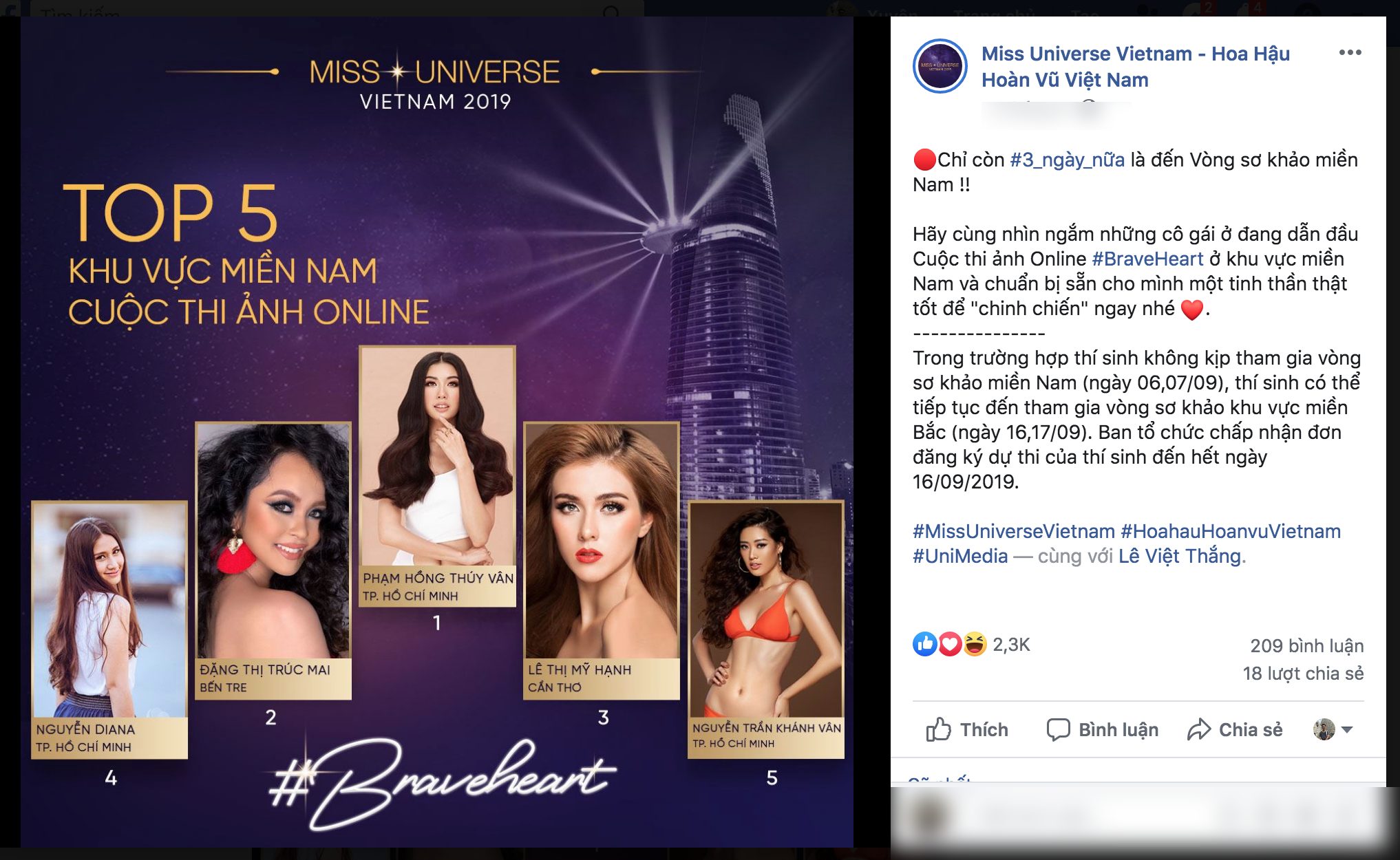 Cách đây ít ngày, hình ảnh của Á hâu Quốc tế Thúy Vân đứng đầu bảng xếp hạng nhờ lượt vote và share “điên đảo” trên mạng xã hội. Fanpage Miss Universe Vietnam cũng công bố Top 5 dẫn đầu bình chọn tại khu vực phía Nam. Theo đó, Phạm Hồng Thúy Vân giữ vị trí số 1.