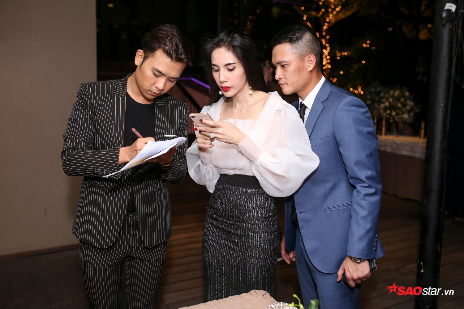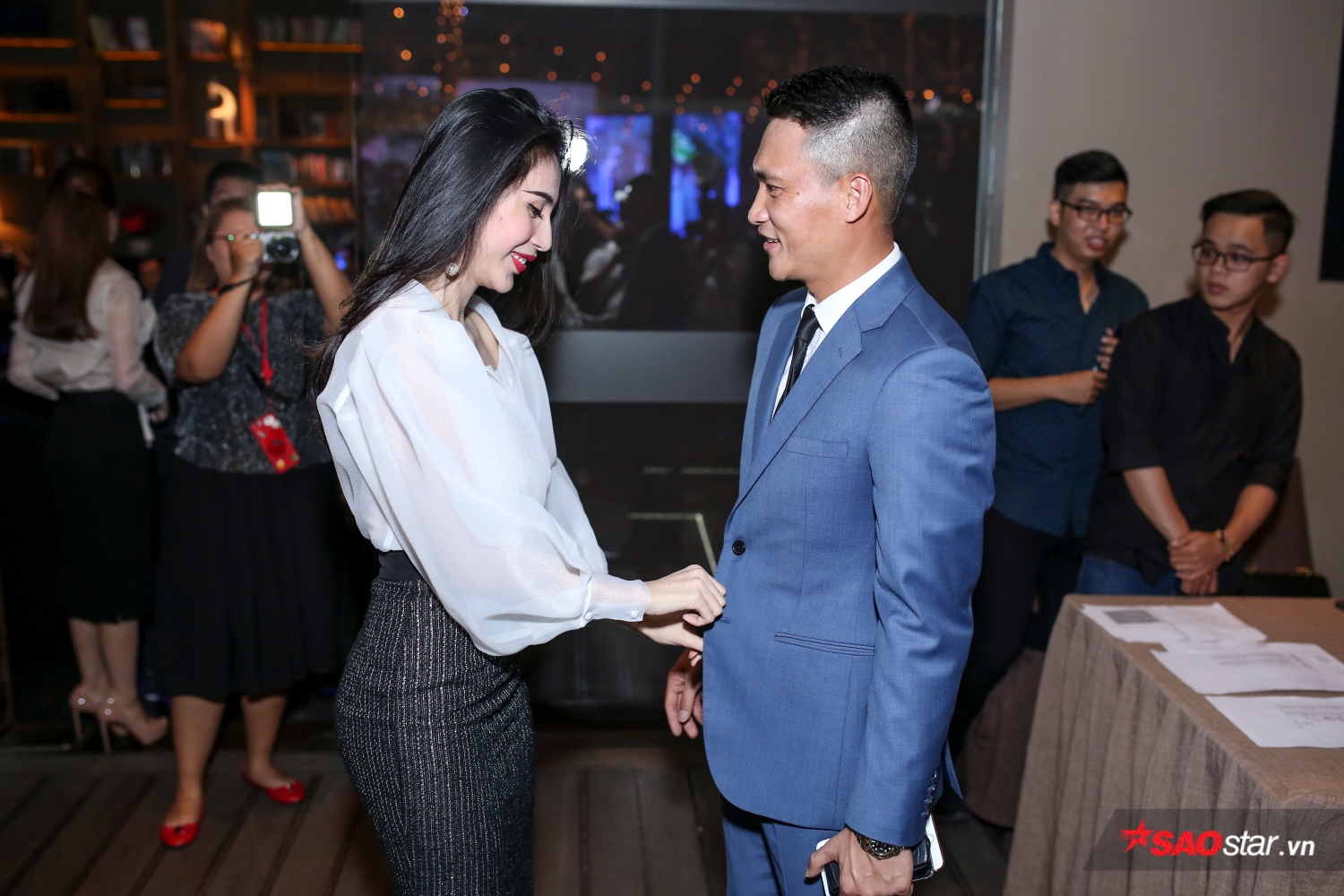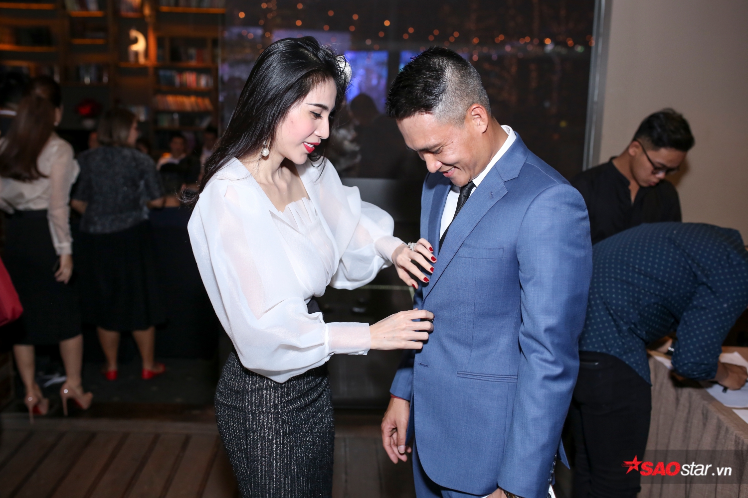 Thủy Tiên ân ần chỉnh áo cho ông xã trước khi sự kiện diễn ra.