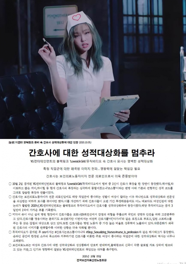 Vào sáng ngày 06/10, YG Entertainment đã đưa ra tuyên bố phản hồi chính thức sau khi một cảnh trong MV ca nhạc Lovesick Girls của BLACKPINK trở thành chủ đề tranh luận sôi nổi trên cộng đồng mạng. Cụ thể, đại diện phía YG đã giải thích về cảnh mặc trang phục y tá gây phản cảm của Jennie.