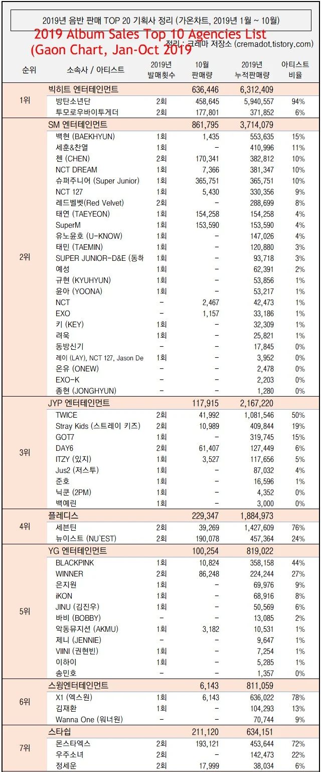 Bảng xếp hạng các công ty bán nhiều album nhất 2019 dựa trên trang tổng hợp uy tín Gaon từ tháng 1/2019 đến tháng 10/2019. Nó cho thấy Big Hit Entertainment - công ty chủ quan của BTS và TXT đứng đầu với 6.312.409 doanh số từ việc bán album. Trong năm 2019 vừa qua, BTS chỉ phát hành một album duy nhất là Map Of The Soul: Persona.