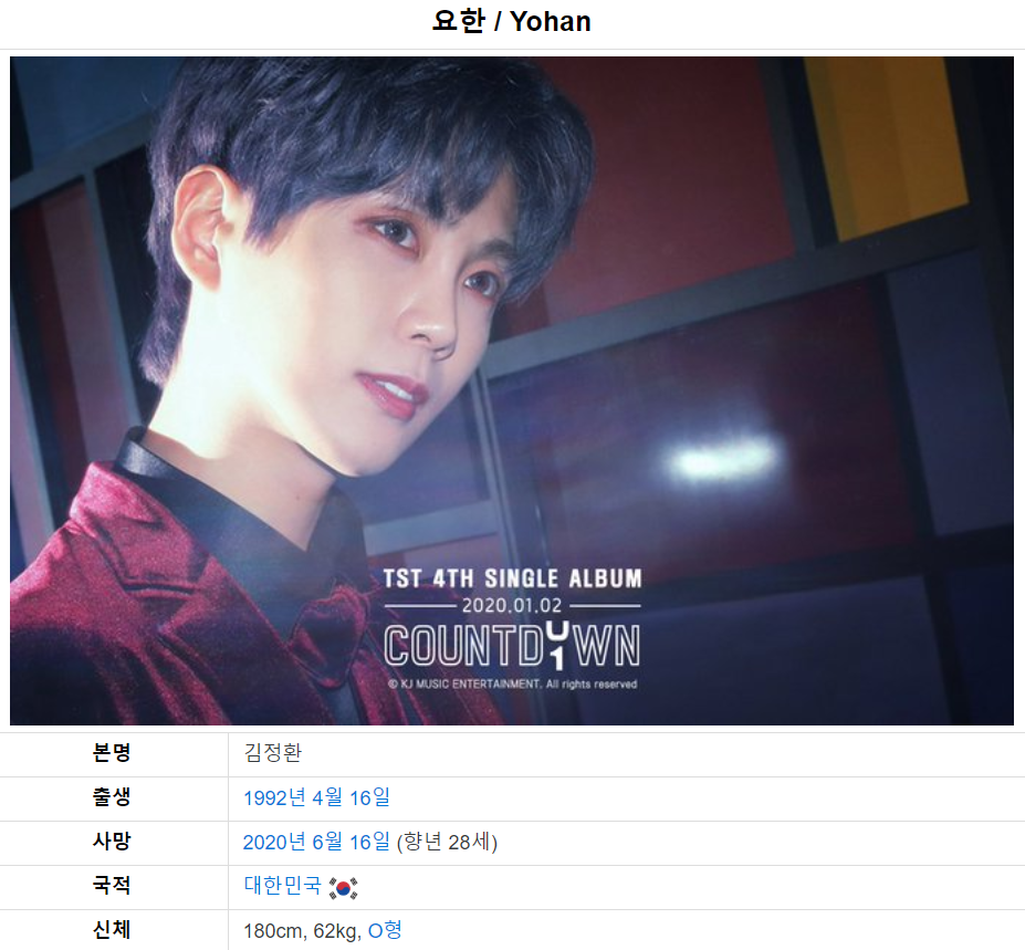 Theo báo cáo độc quyền từ SPOTV News vào sáng sớm ngày 17/06, chàng ca sĩ thần tượng Yohan (tên thật: Kim Jeong Hwan) đã “nhắm mắt xuôi tay” ở tuổi 28. Cụ thể, ngôi sao sinh năm 1992 đã rời khỏi thế giới này vào ngày 16/06, tròn hai tháng ngày tổ chức sinh thần bước sang tuổi mới (16/04). Theo đó, nguyên nhân cái chết không được tiết lộ theo ý muốn của gia quyến.
