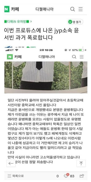 Xoay quanh việc thí sinh Yoon Seobin của chương trình Produce X 101 bị cáo buộc sử dụng rượu và thuốc lá, vi phạm bạo lực học đường, mặc dù đại diện phía JYP Entertainment và Mnet đã lên tiếng xin lỗi, hủy hợp đồng quản lý và truất quyền tham gia chương trình của anh chàng nhưng dư luận vẫn chưa hẳn dịu xuống. Mới đây, một người hiểu biết về Yoon Seobin lần nữa đưa ra thông báo minh oan thay cho anh chàng.