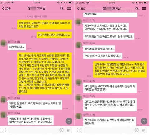 Tiếp đó là lời nhận xét của huấn luyện viên thể thao tại trường trung học, cũng là người trực tiếp giảng dạy cho Yoon Seobin. Ông chia sẻ:“Tôi không thân với Byungwhi (tên trước của Seobin) (…) Cậu ấy không phải là đứa trẻ đánh và làm hại người khác. (…) Xem các bài đăng được tải lên, tôi thấy chúng chúng không đúng sự thật. Tôi cảm thấy thất vọng khi chúng được lan truyền như thể sự thật là thế vậy”.