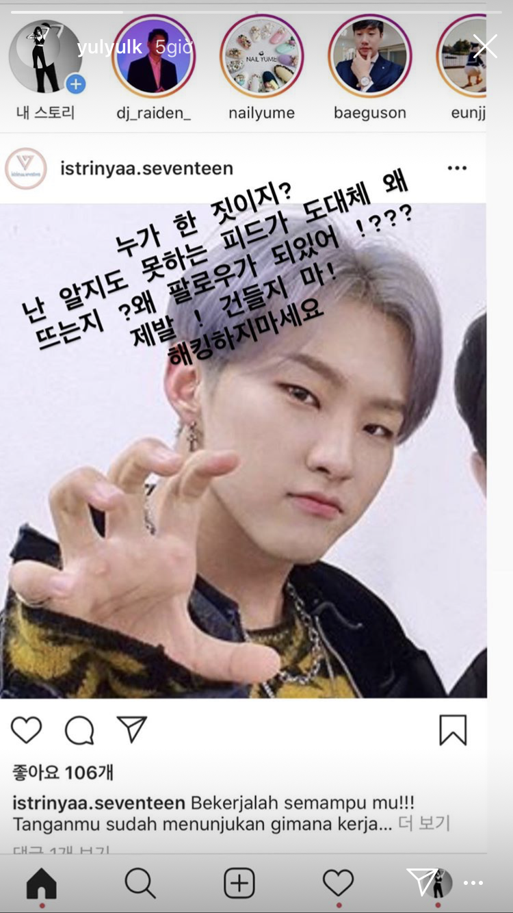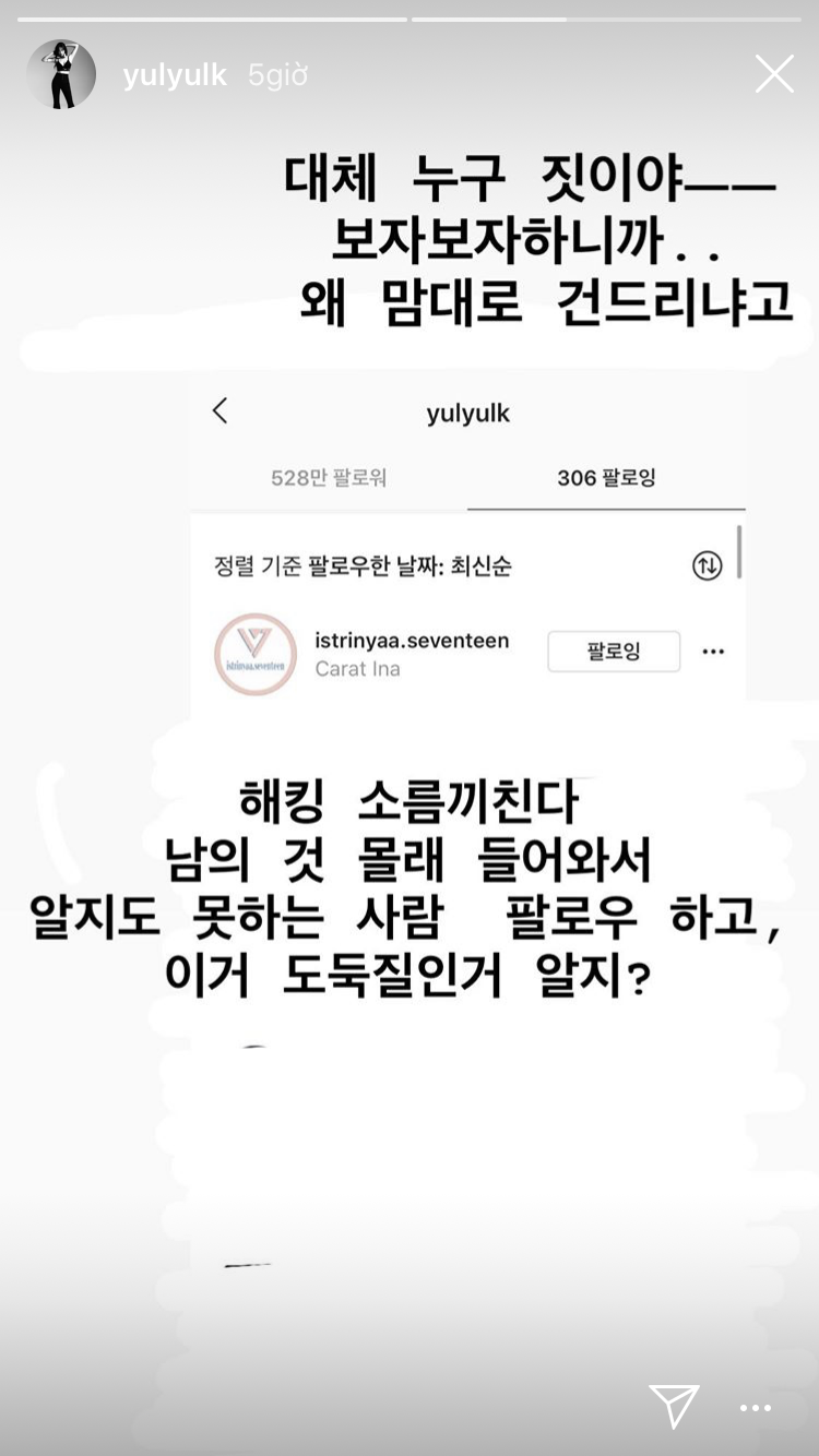 Yuri cũng chụp lại màn ảnh bài đăng về hình ảnh của Hoshi (Seventeen) kèm theo chú thích: “Ai đã làm điều này? Tại sao tôi nhận được một nguồn dữ liệu tôi thậm chí còn không biết? Tại sao tôi lại theo dõi tài khoản đó?”. Sau đó, Yuri nói thêm: “Làm ơn đừng đừng vào (tài khoản của tôi)! Đừng hack nó!”.