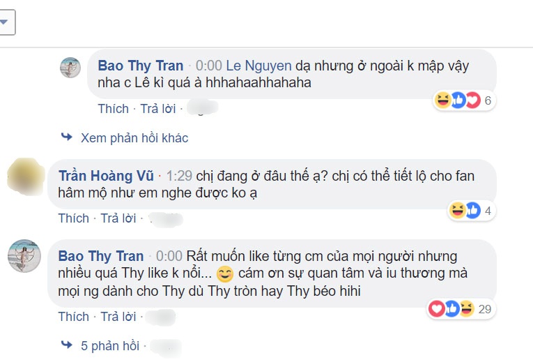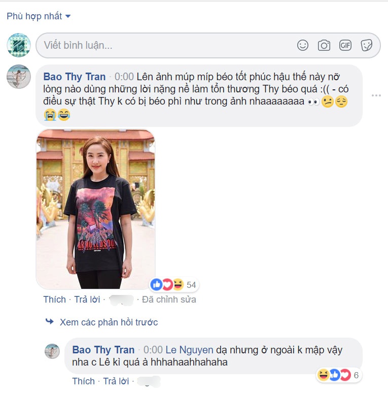 Đến ngay cả việc trả lời bình luận với fan, Bảo Thy vẫn không quên khẳng định bản thân có phần “múp” nhưng chưa đến mức như trên ảnh.
