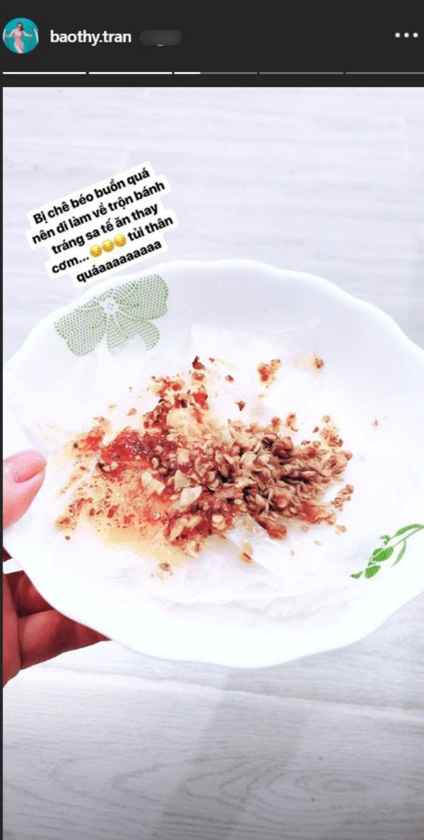 Bị chê “béo” nên Bảo Thy quyết định trộn bánh tráng sa tế ăn để thay cơm.