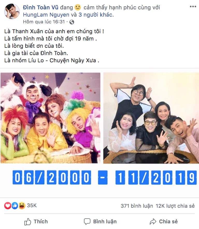 Bài viết của nghệ sĩ Đình Toàn nhận được hơn 35.000 lượt thả cảm xúc và hơn 12.000 lượt chia sẻ. Dưới phần bình luận, hàng nghìn khán giả nói lên cảm xúc của mình về chương trình tuổi thơ ấy cũng như những tình cảm mà họ dành cho nhóm Líu Lo.