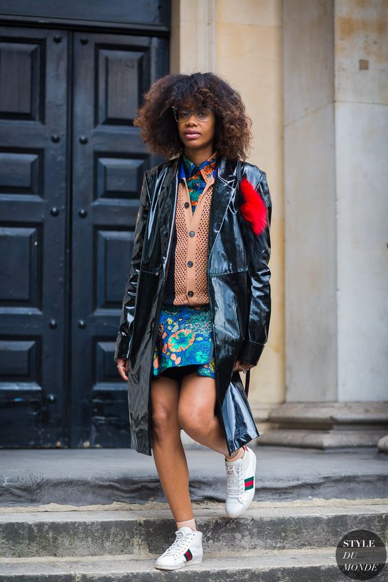 Áo khoác plastic, xu hướng thời thượng của năm 2018 nhanh chóng được Jan Quammie ứng dụng. Với gu thời trang ấn tượng cùng khiếu thẩm mỹ tinh tế, cô nàng phối chiếc áo khoác có phần “khó nhằn” cùng với sơ mi và chân váy hoa gam màu lạnh. Ngoài ra, đôi sneaker đơn giản của Gucci cũng góp phần giúp bộ cánh không bị “làm quá”.