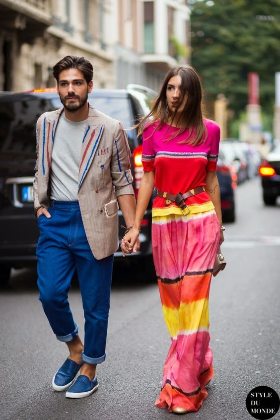 Bên cạnh đó, cách phối trang phục khéo léo khiến cả hai vượt qua khỏi suy nghĩ thông thường của nhiều người về cách diện đồ đôi. Không còn là hai bộ cánh giống nhau như đúc, Giotto Calendoli và Patricia Manfield lựa chọn cách phối nhấn nhá chi tiết, đơn cử như họa tiết sọc trên áo này.