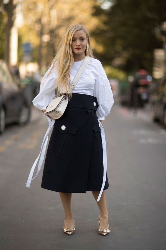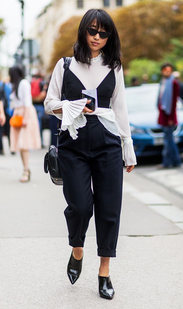 Set đồ đơn giản với hai tông màu đen trắng được nâng tầm lên rất nhiều khi được phối với đôi giày hoa nổi bật.