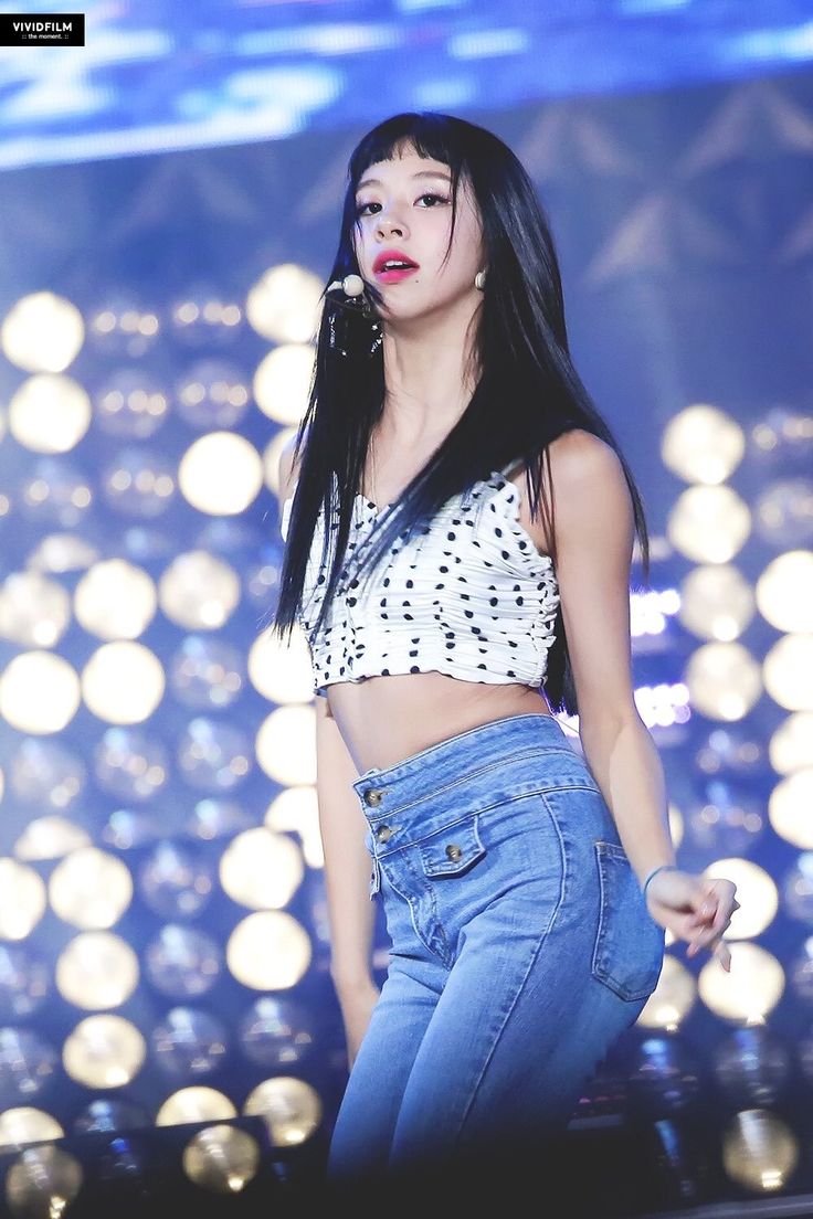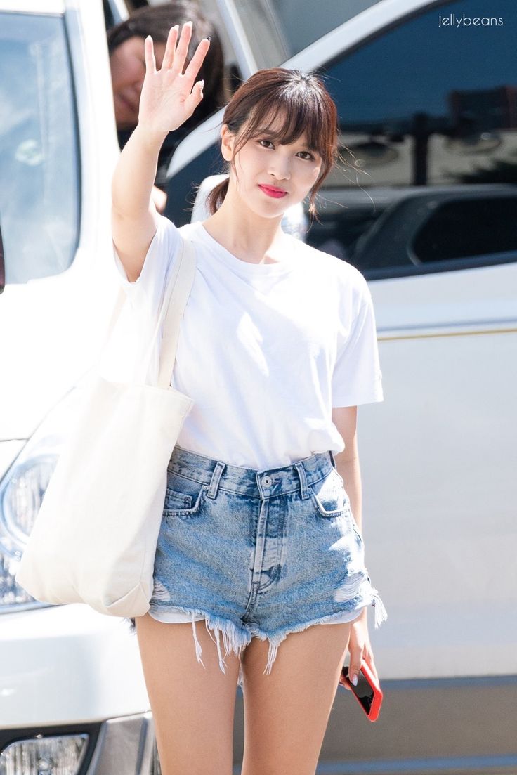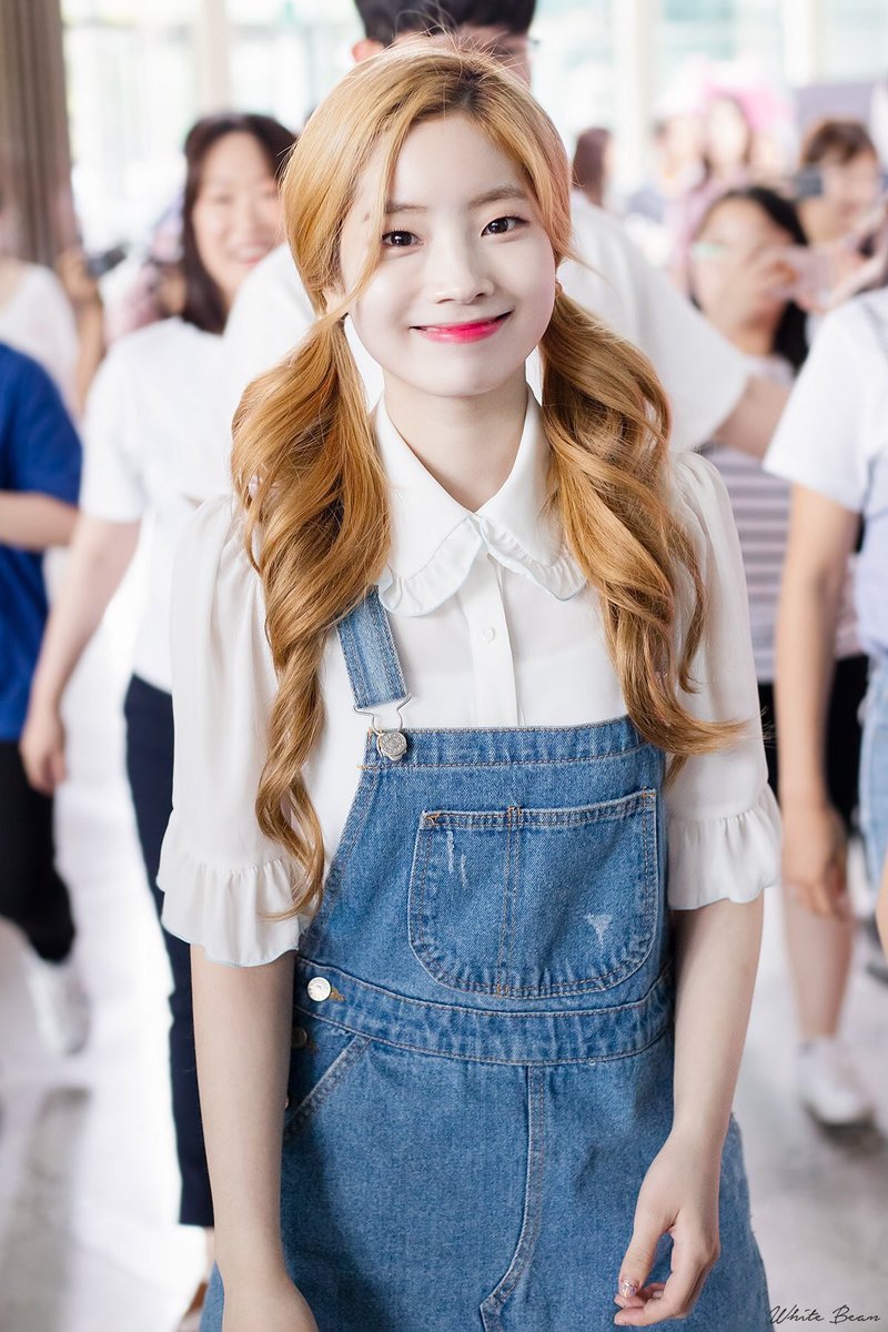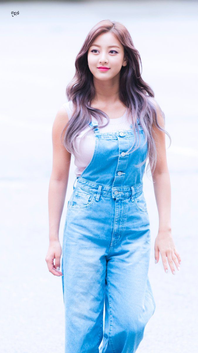 Jihyo và Dahyun trở nên nghịch ngợm pha chút duyên dáng khi diện quần yếm bò. Nếu không ngại hở, thay vì mặc áo phông, bạn có thể diện áo crop top ở trong nhé.