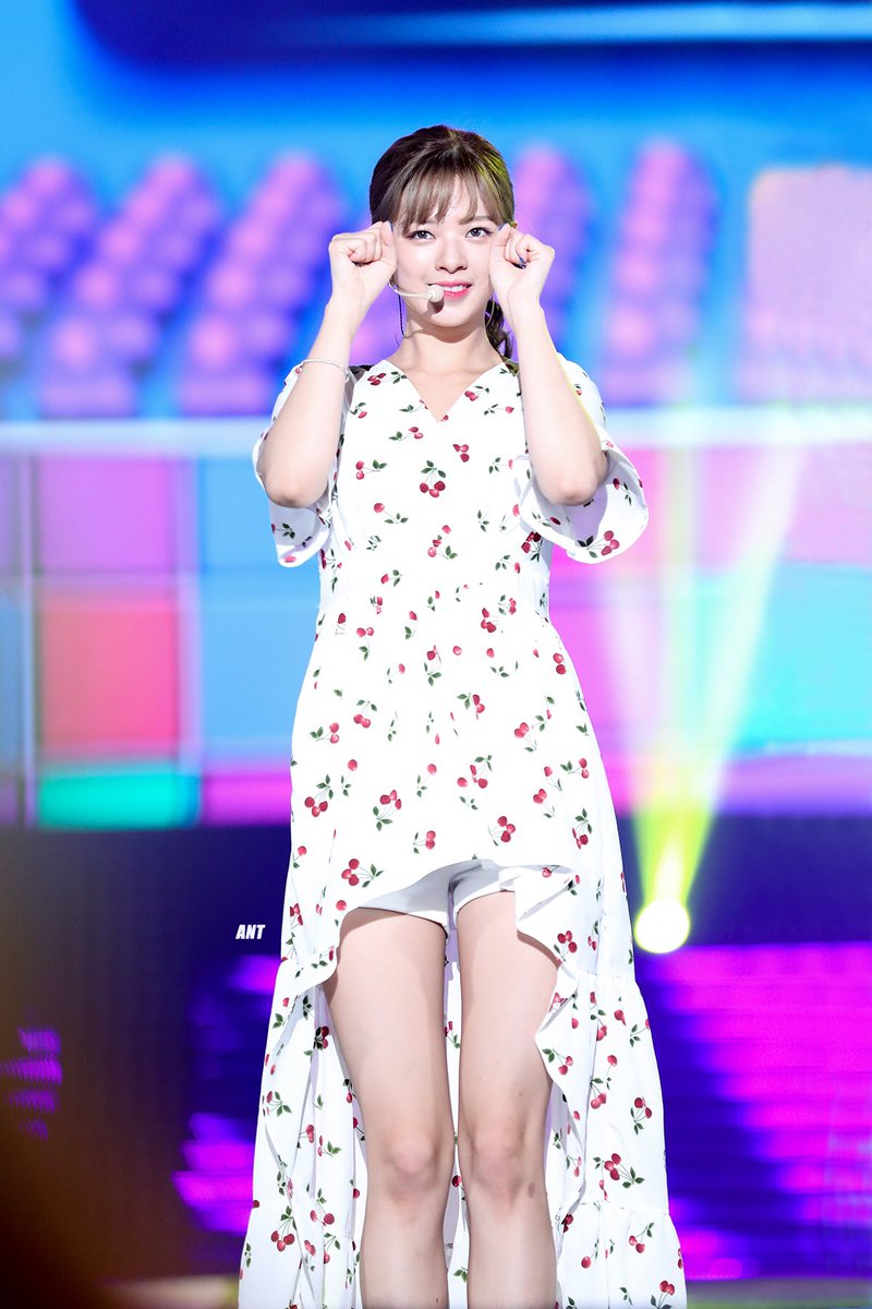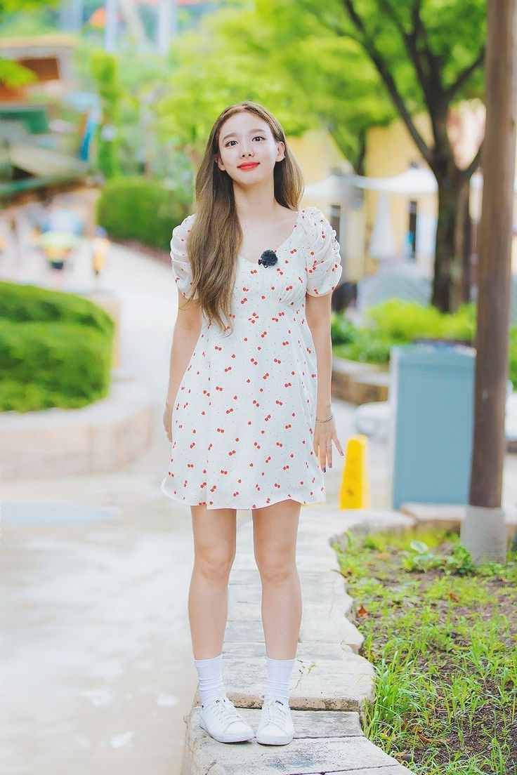 Nayeon trông thật đáng yêu với chiếc váy trắng kèm họa tiết cherry. Cô nàng kết hợp cùng giày thể thao để giảm bớt sự ‘bánh bèo’.