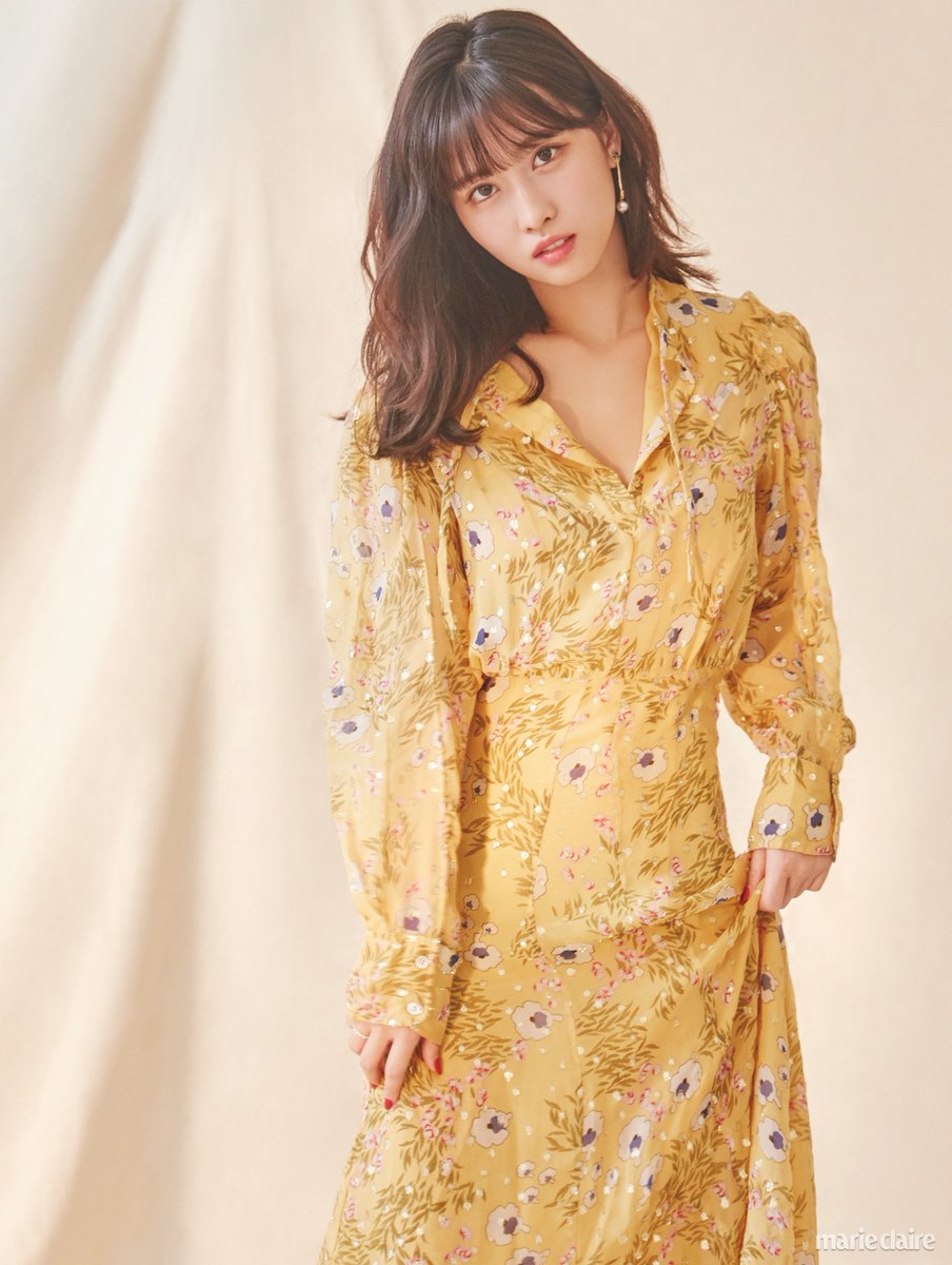 Váy voan là một lựa chọn phổ biến vào mùa hè, nhưng Momo trông giống như ánh nắng tinh khiết trong chiếc váy dài màu vàng này.