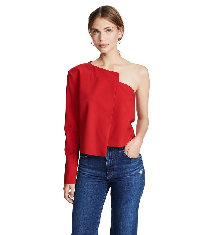 Chiếc áo đỏ ấn tượng phối cùng jeans xanh basic này là một set đồ khá thú vị cho bạn gái trong dịp Tết này.
