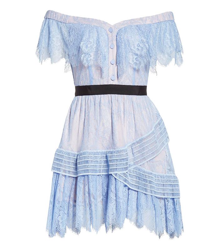 Nếu muốn trở nên nhẹ nhàng, nữ tính hơn, các bạn gái không thể bỏ qua chiếc váy xanh nhạt phối ren mềm mại. 1 đôi giày đỏ sẽ là gợi ý rất hay giúp bạn tự tin xuống phố.