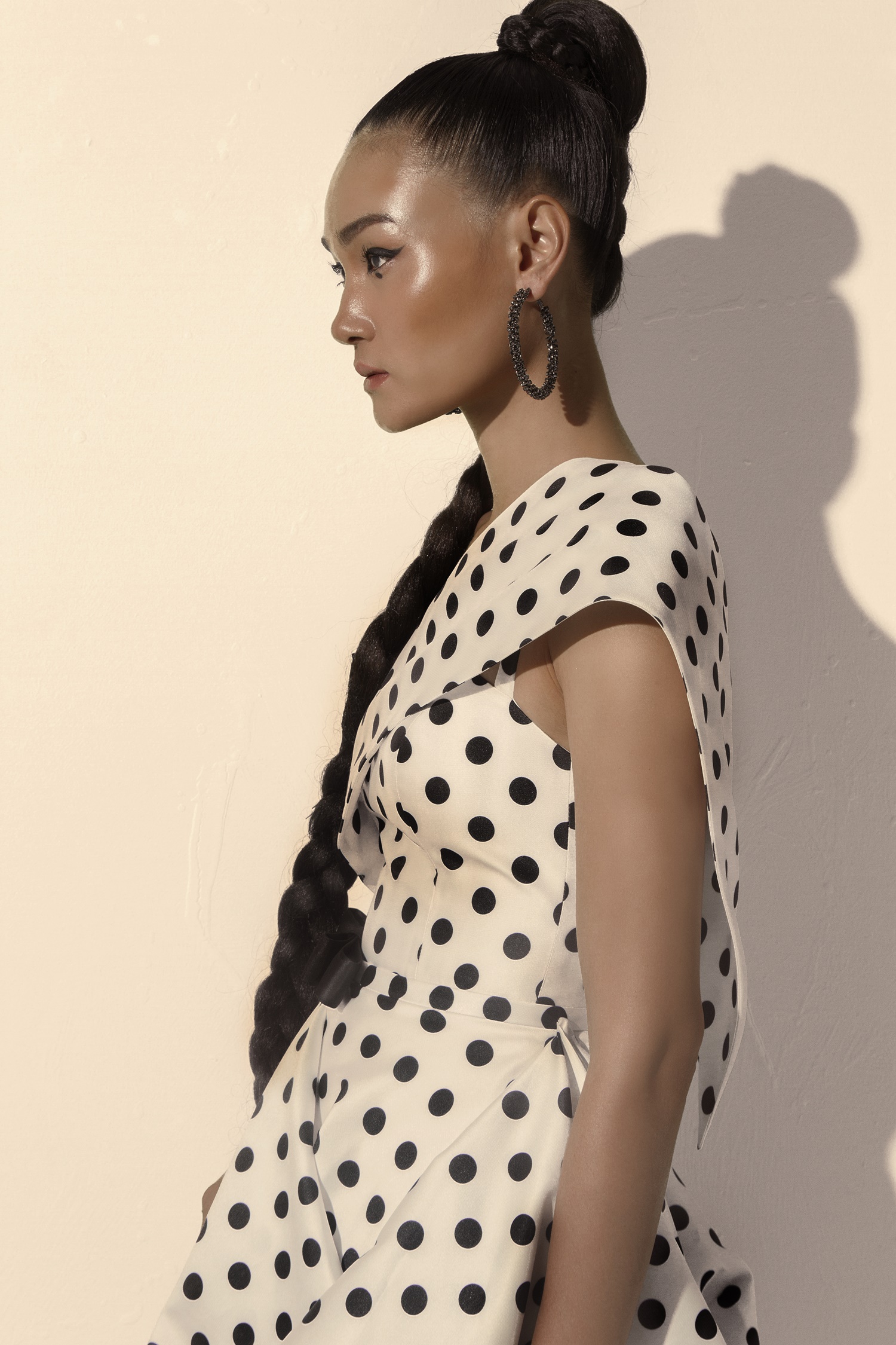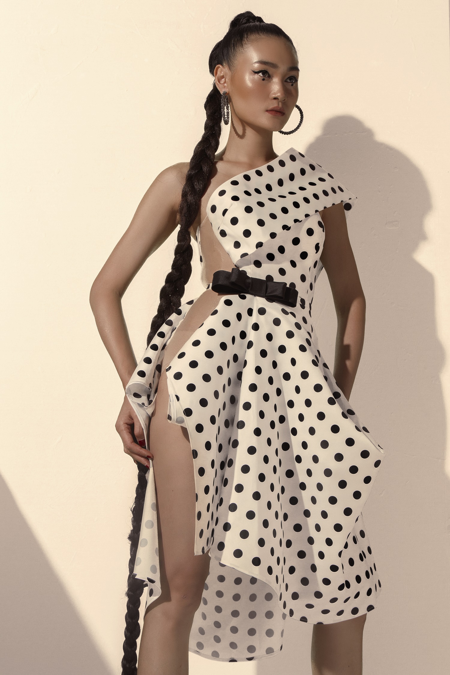 Người mẫu Thuỳ Trang khoe đường cong nóng bỏng trong thiết kế đầm chấm bi bất đối xứng với khoảng hở táo bạo được NTK Tăng Thành Công xử lí khéo léo, tinh tế.